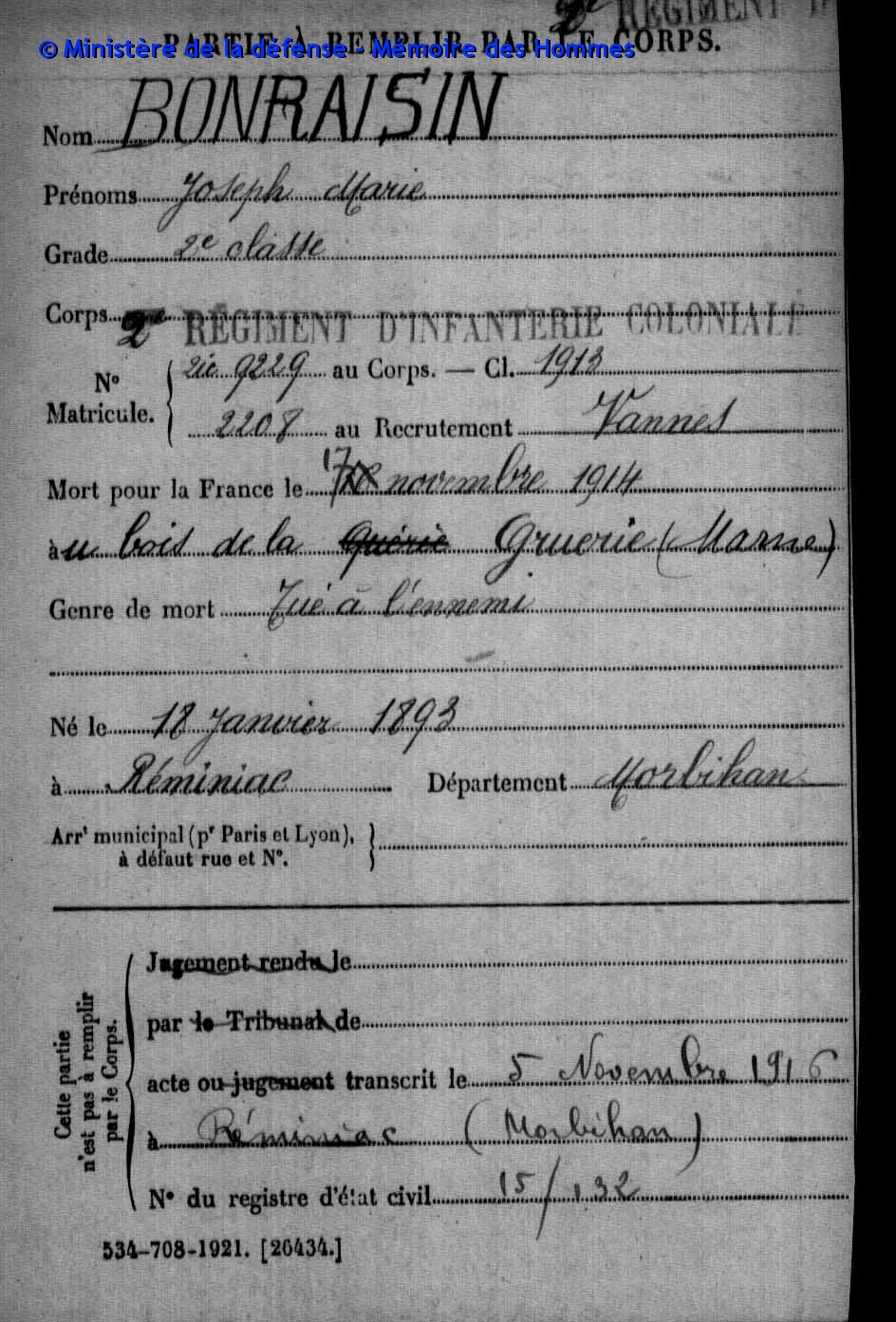 CARRIÈRE MILITAIREGrade: Date du décès: 1914 Cause du décès: Lieu du décès: Lieu d'inhummation: Monument aux morts: Reminiac 56 - Morbihan