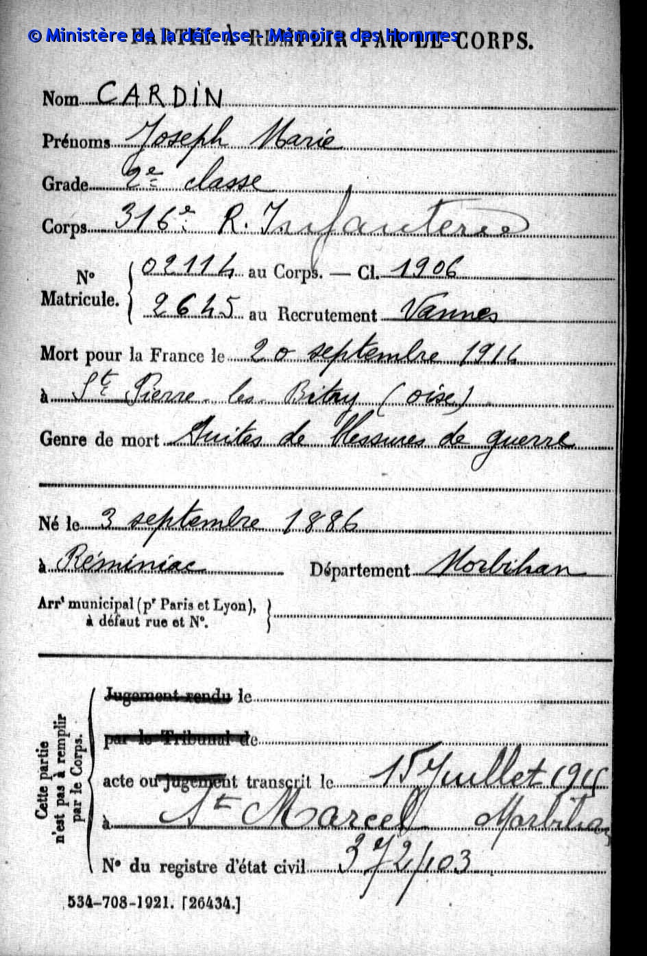 CARRIÈRE MILITAIREGrade: Date du décès: 1914 Cause du décès: Lieu du décès: Lieu d'inhummation: Monument aux morts: Reminiac 56 - Morbihan