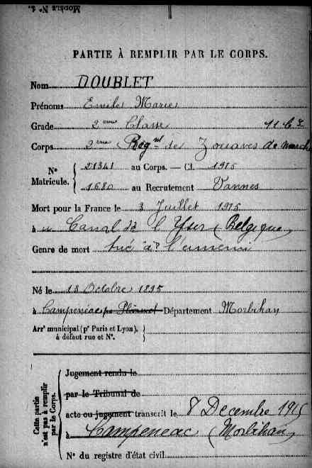CARRIÈRE MILITAIREGrade: Date du décès: 03/07/1915 Cause du décès: Lieu du décès: Boësinghe, Canal de l'Yser Lieu d'inhummation: Monument aux morts: Campeneac 56 - Morbihan